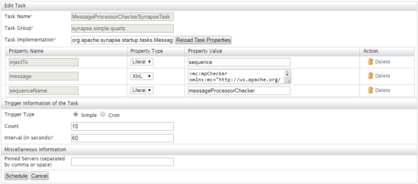 Pero a la misma vez, esta tarea predefinida es una clase Java denominada org.apache.synapse.startup.tasks.MessageInjector y la cual también implementa la clase Task. Creando la tarea a través de la consola de administración, nos evitaremos tener que reiniciar el servidor y tendremos un mayor control en el caso de que la programación Java no sea nuestro fuerte.