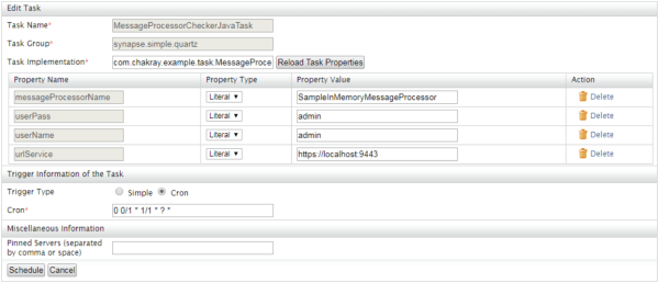 Pero a la misma vez, esta tarea predefinida es una clase Java denominada org.apache.synapse.startup.tasks.MessageInjector y la cual también implementa la clase Task. Creando la tarea a través de la consola de administración, nos evitaremos tener que reiniciar el servidor y tendremos un mayor control en el caso de que la programación Java no sea nuestro fuerte.