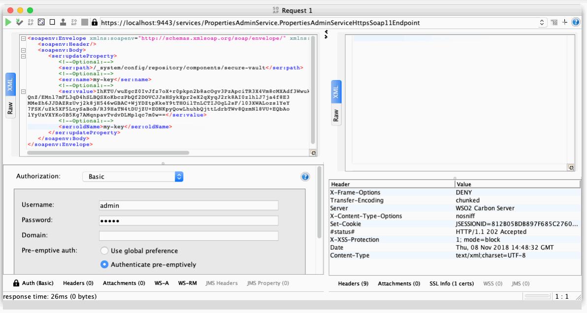 These SOAP services need Basic Authentication of a user belonging to the admin role (default admin user and password are admin/admin). We will use SoapUI for our sample calls.