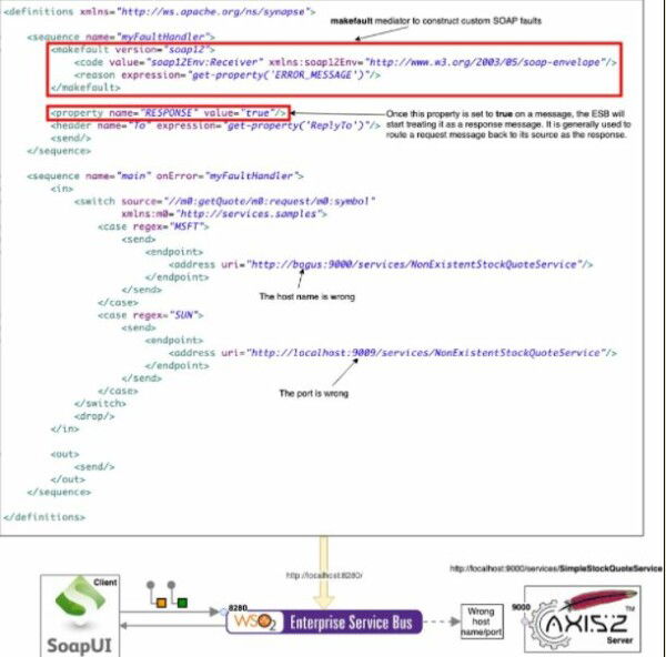 All this code is located within the EI. The request coming from the client side goes through the main sequence. In that sequence, if an error arises, the myFaultHandler sequence is in charge to processing the error, as indicated by onError in the main sequence. Now the message goes to the IN mediator. There is a switch mediator that looks for the value symbol in the request. It can have two values MSFT or SUN. If the value matches MSFT then the message is sent to an endpoint whose name has been incorrectly spelled. While if the value is SUN the request is sent to the correct endpoint in localhost.